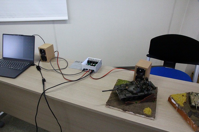 - 更北中立林君はプログラムでアンプを作り現在オーディオからのアンプでインピーダンス、バランスなどの整合性について研究中。テスト機器としてエレキギターを採用しています。(テケテケ)