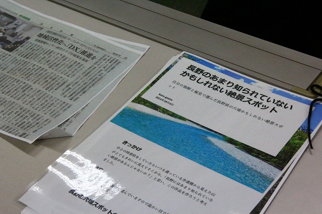 須坂市内の中学校より新入部員2名を迎え、既存のメンバーからは中間発表に向け今取り組んでいることのプレゼンが行われました。