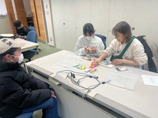 相森中岡崎君はまだやりたい事が決まってはいないがプログラミング教室で使用しているテキストを使いLEDを光らせる・ブザーを鳴らす、まで進みました。