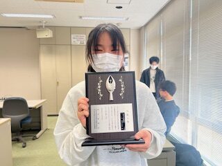 メンバーの西澤ひなたさんが読売新聞社・全日本科学教育振興委員会・国立研究開発法人科学技術振興機構主催の第69回日本学生科学賞を受賞されました。全員で拍手でお祝いしました。手作りの人形は細菌を説明するためのツールです。